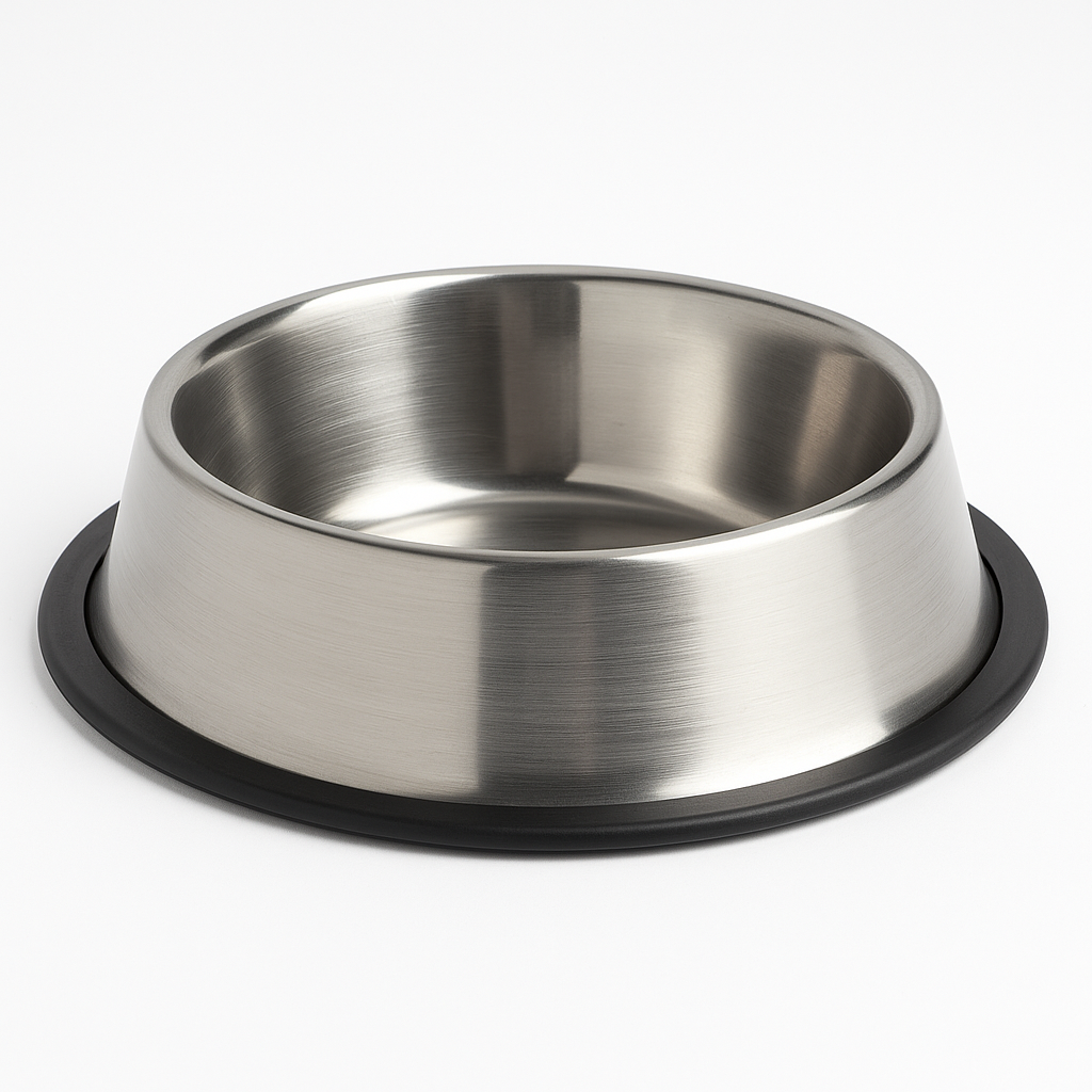 A durable feeding bowl made of premium stainless steel, resistant to rust and daily wear. The bowl has a diameter of 14 cm and a height of 5 cm, offering a 350 ml capacity suitable for cats and small to medium dogs. The bottom is fitted with a non-slip rubber ring that prevents sliding while eating and also reduces noise. Easy to clean and dishwasher safe, designed for long-term hygienic use.